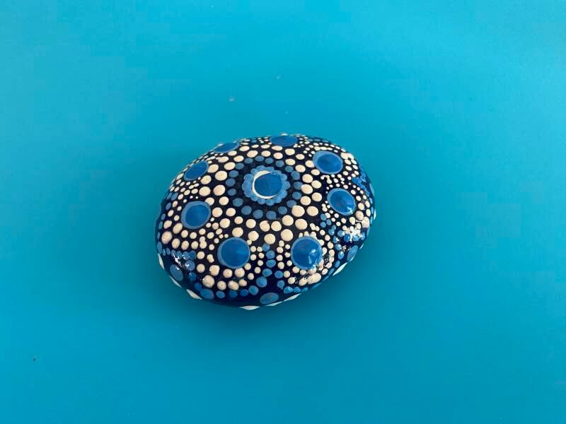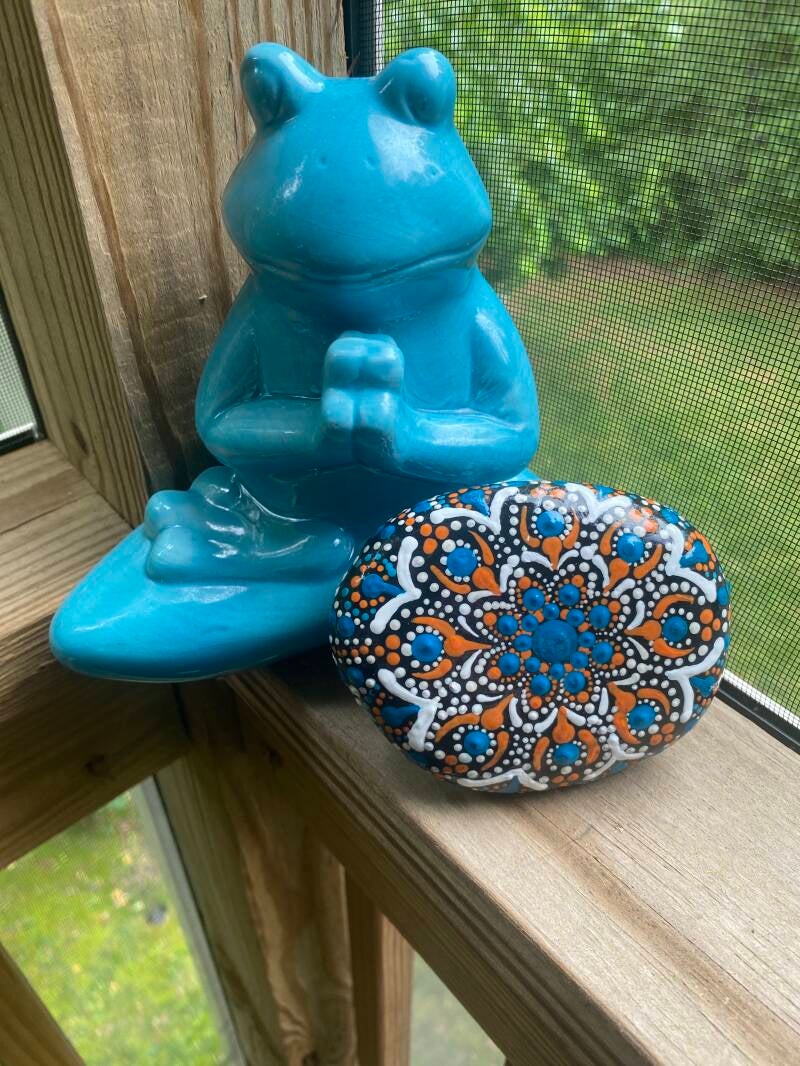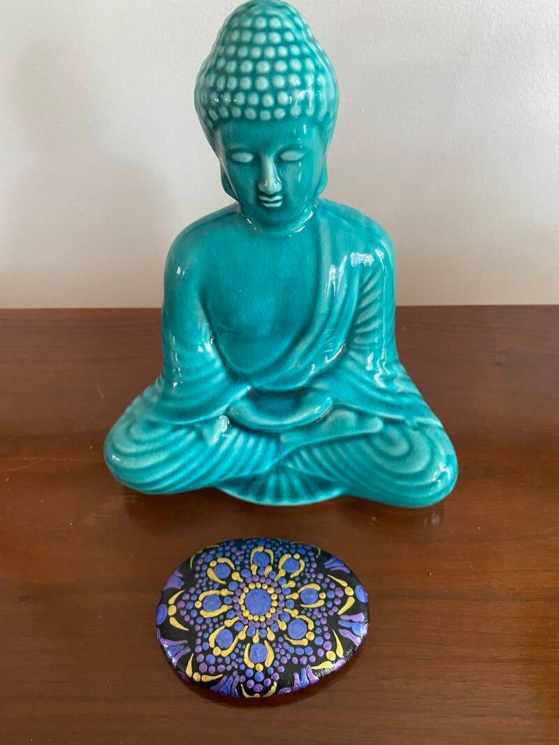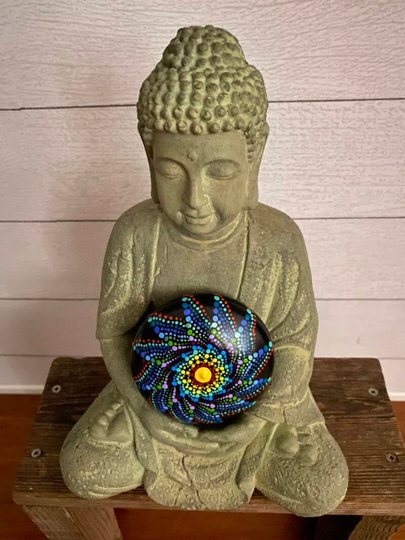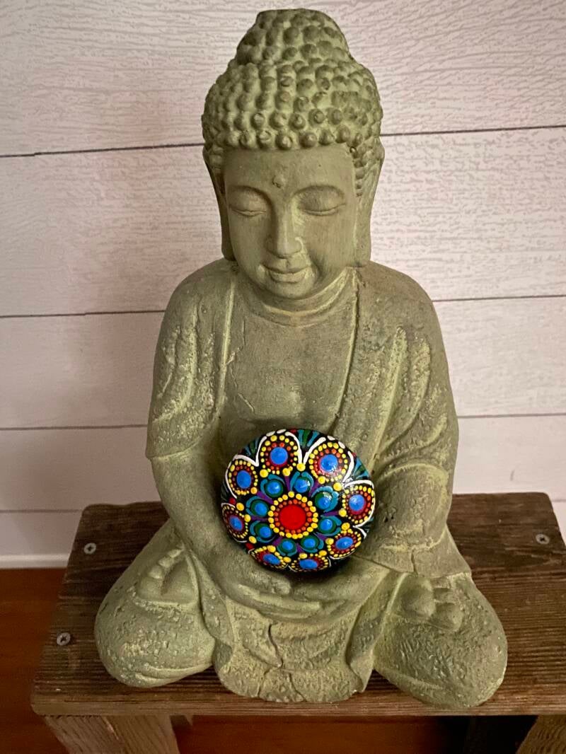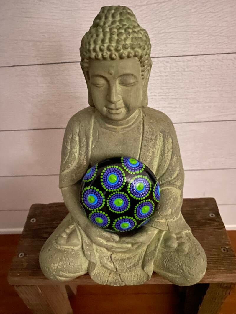 The Mandala stones always begin with a center dot that radiates to the outer edges, to complete the pattern. The Stones are great gifts for a friend and are used for paperweights. A Mandala stone is a symbol of the universe in its ideal form. Its creation signifies the transformation of a universe of suffering into one of joy. It helps, while meditating, to envision how to achieve the perfect self. It can be deeply therapeutic and used as grounding. You can also walk bare footed on the dirt or grass, for grounding.