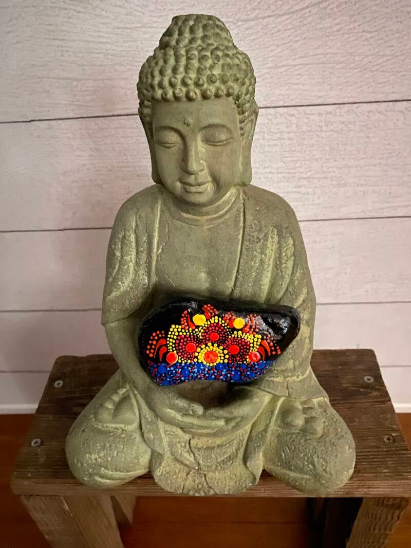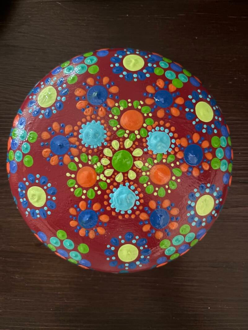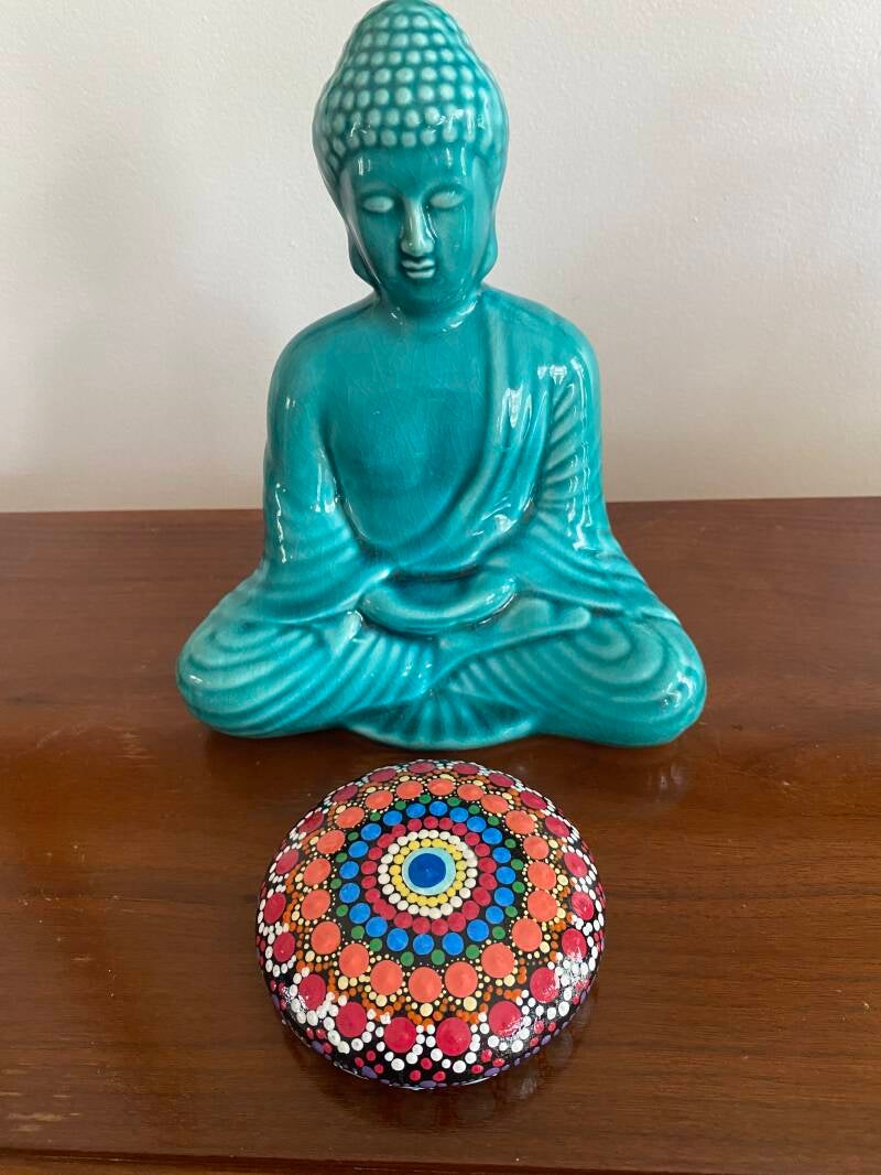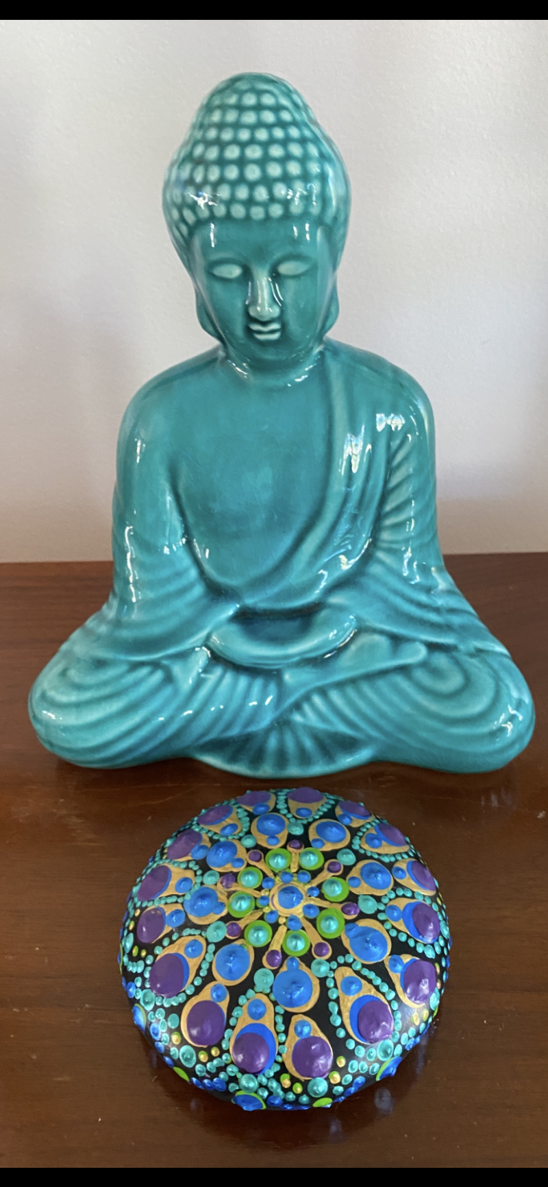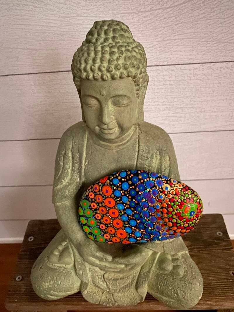 The Mandala stones always begin with a center dot that radiates to the outer edges, to complete the pattern. The Stones are great gifts for a friend and are used for paperweights. A Mandala stone is a symbol of the universe in its ideal form. Its creation signifies the transformation of a universe of suffering into one of joy. It helps, while meditating, to envision how to achieve the perfect self. It can be deeply therapeutic and used as grounding. You can also walk bare footed on the dirt or grass, for grounding.