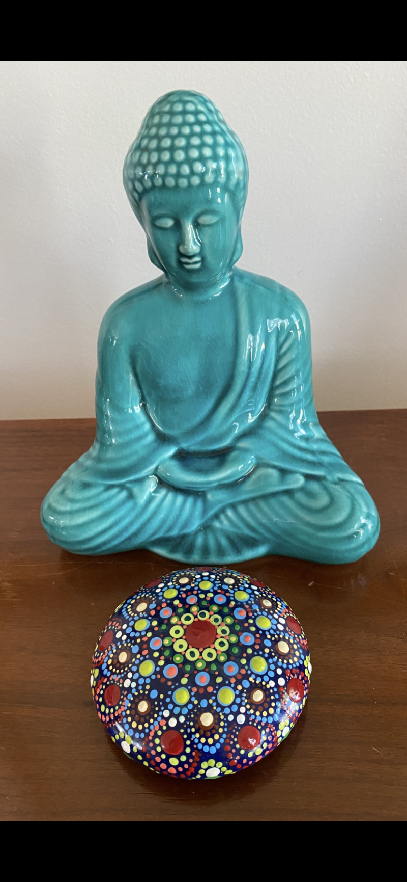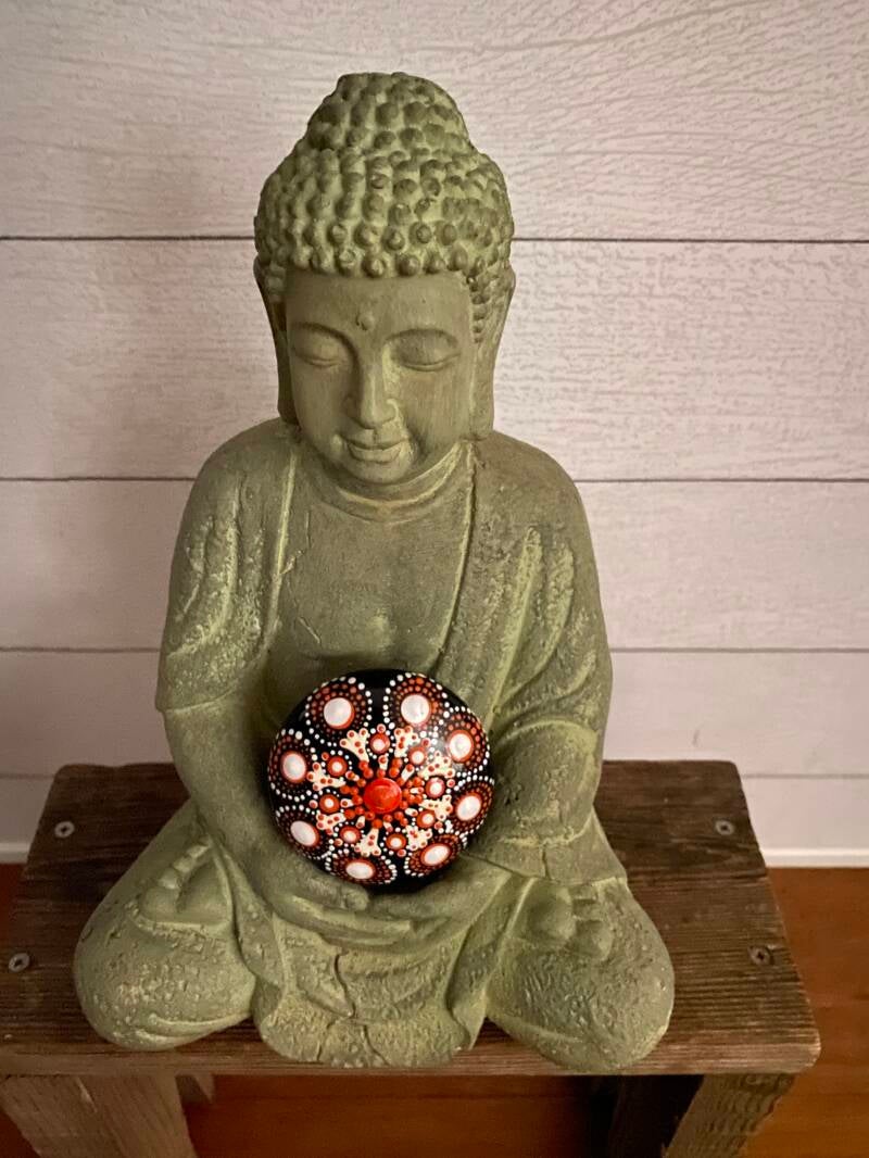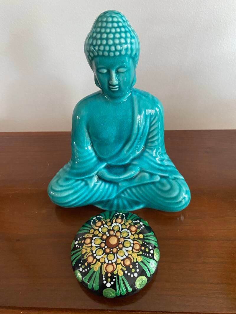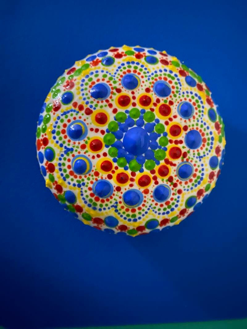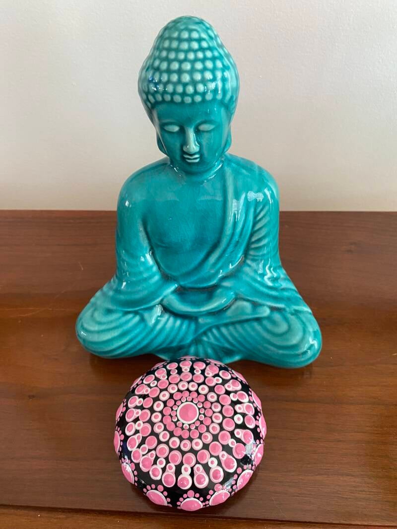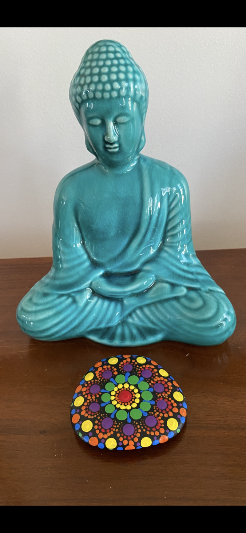The Mandala stones always begin with a center dot that radiates to the outer edges, to complete the pattern. The Stones are great gifts for a friend and are used for paperweights. A Mandala stone is a symbol of the universe in its ideal form. Its creation signifies the transformation of a universe of suffering into one of joy. It helps, while meditating, to envision how to achieve the perfect self. It can be deeply therapeutic and used as grounding. You can also walk bare footed on the dirt or grass, for grounding.