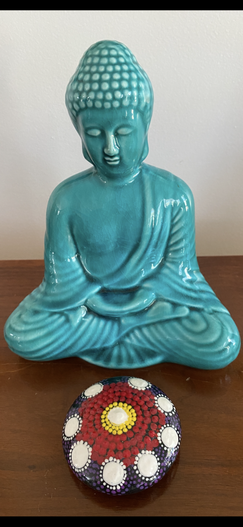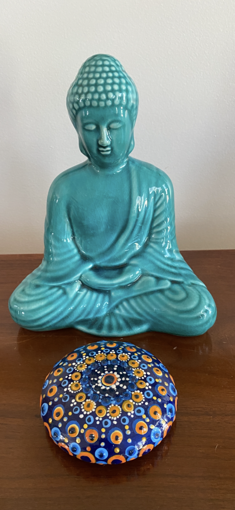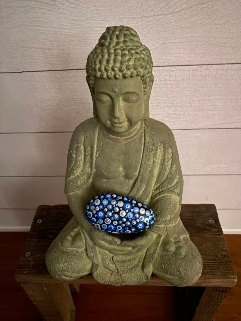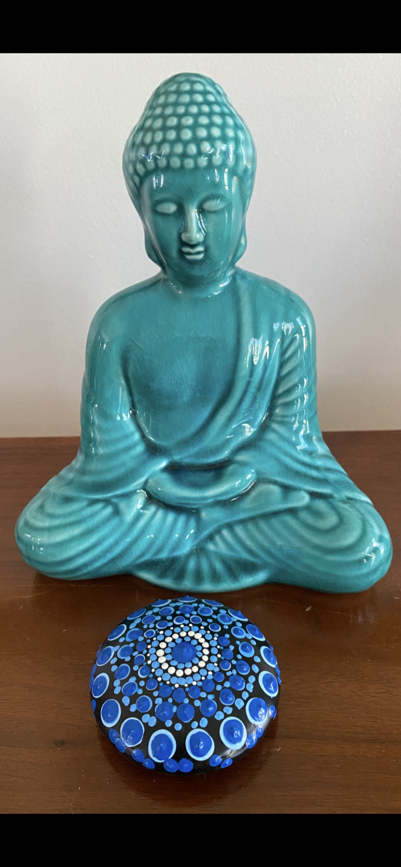 The Mandala stones always begin with a center dot that radiates to the outer edges, to complete the pattern. The Stones are great gifts for a friend and are used for paperweights. A Mandala stone is a symbol of the universe in its ideal form. Its creation signifies the transformation of a universe of suffering into one of joy. It helps, while meditating, to envision how to achieve the perfect self. It can be deeply therapeutic and used as grounding. You can also walk bare footed on the dirt or grass, for grounding.